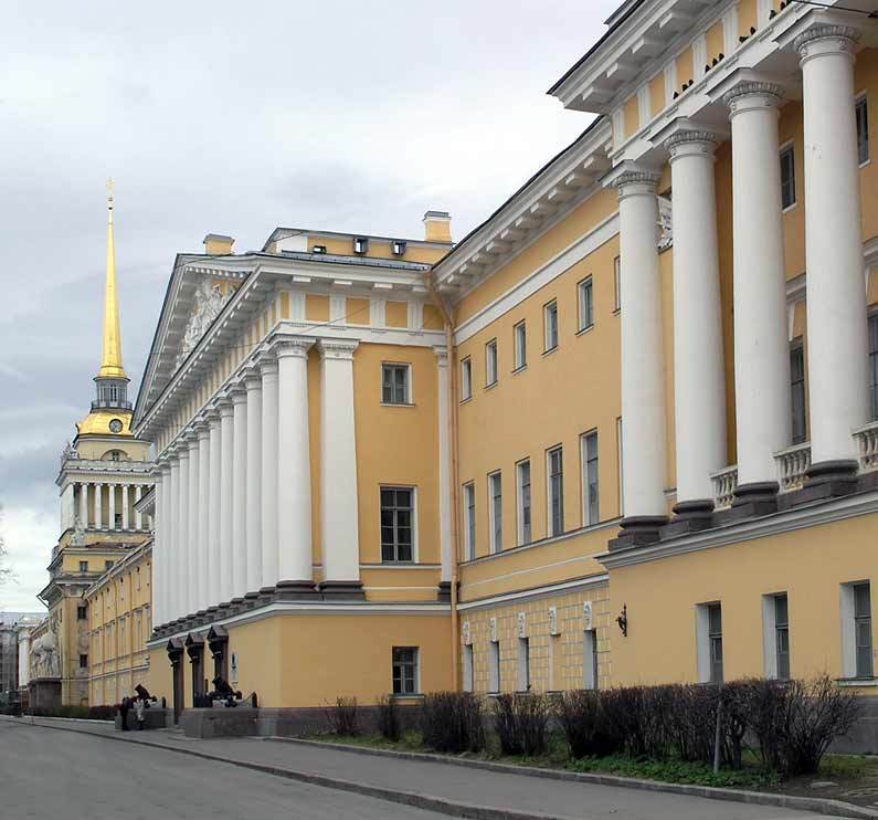 Главное Адмиралтейство строилось в период с 1806 по 1823 гг. архитектором А. Д. Захаровым на месте Адмиралтейской верфи, которая была заложена в 1704 г. Петром I, как главная судостроительная вeтвь страны на Балтийском море. Главные здания Адмиралтейства образовывали большое П-образное сооружение